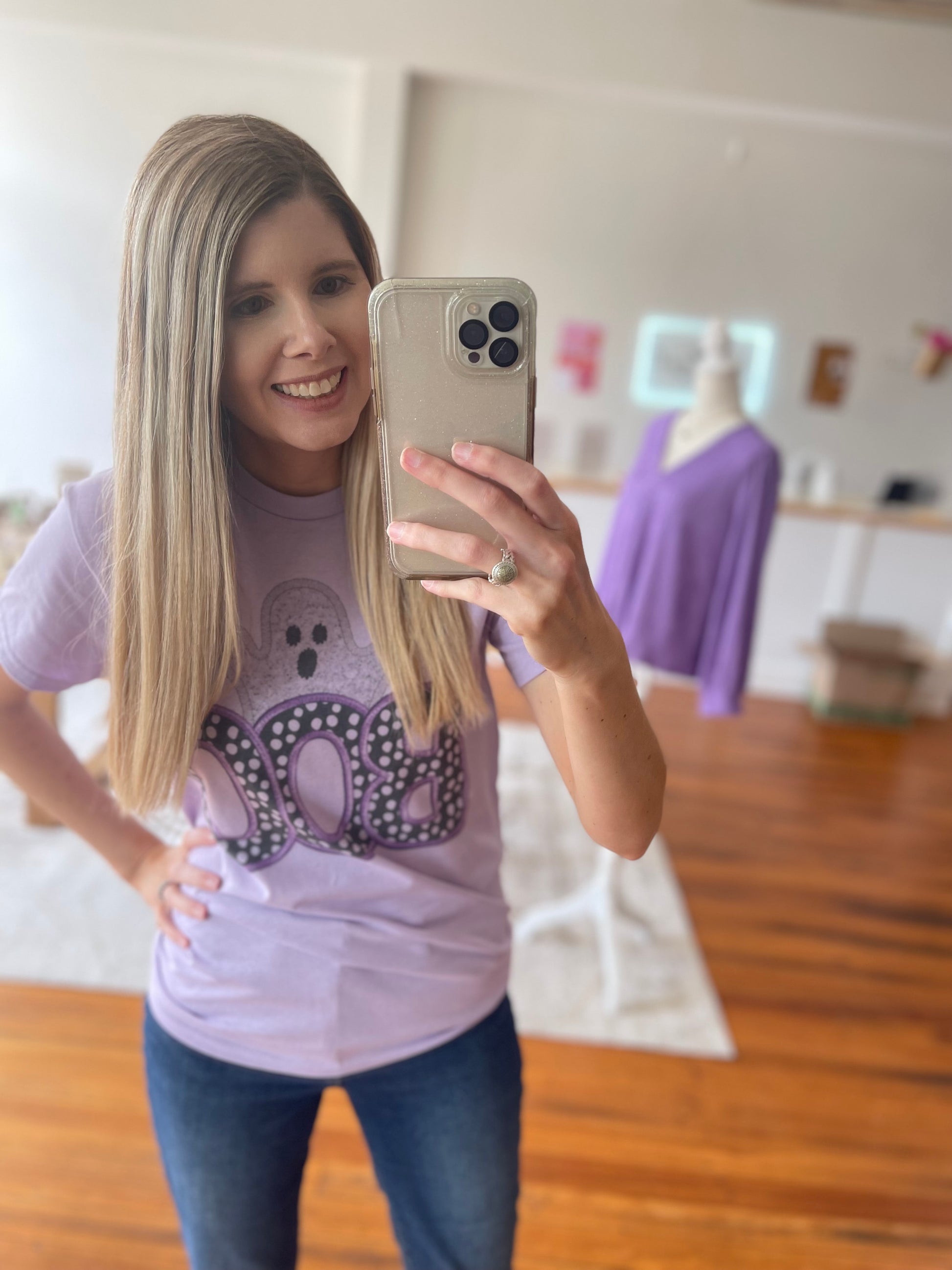 Meet the Boo Ghost tee, printed with a durable sublimation process in-house to deliver bright, long-lasting color on a soft lilac fabric. The sublimation method inks the fibers for a smooth, crack-free finish that stays vibrant night after night.