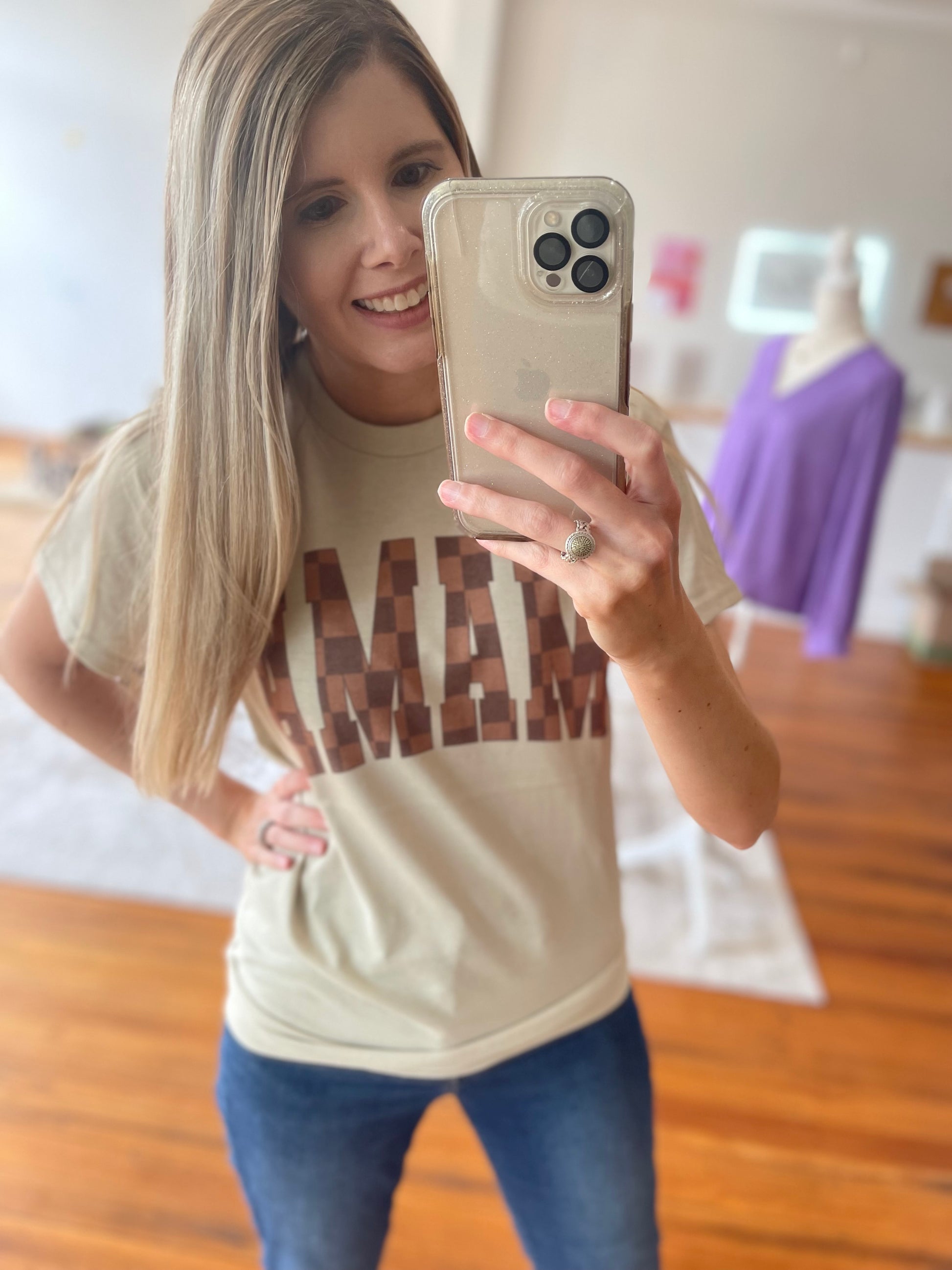 Carefree to wear and easy to style, the Checkered Brown Mama Sub Tee pairs with jeans, joggers, or casual skirts for a versatile look that fits your everyday vibe.