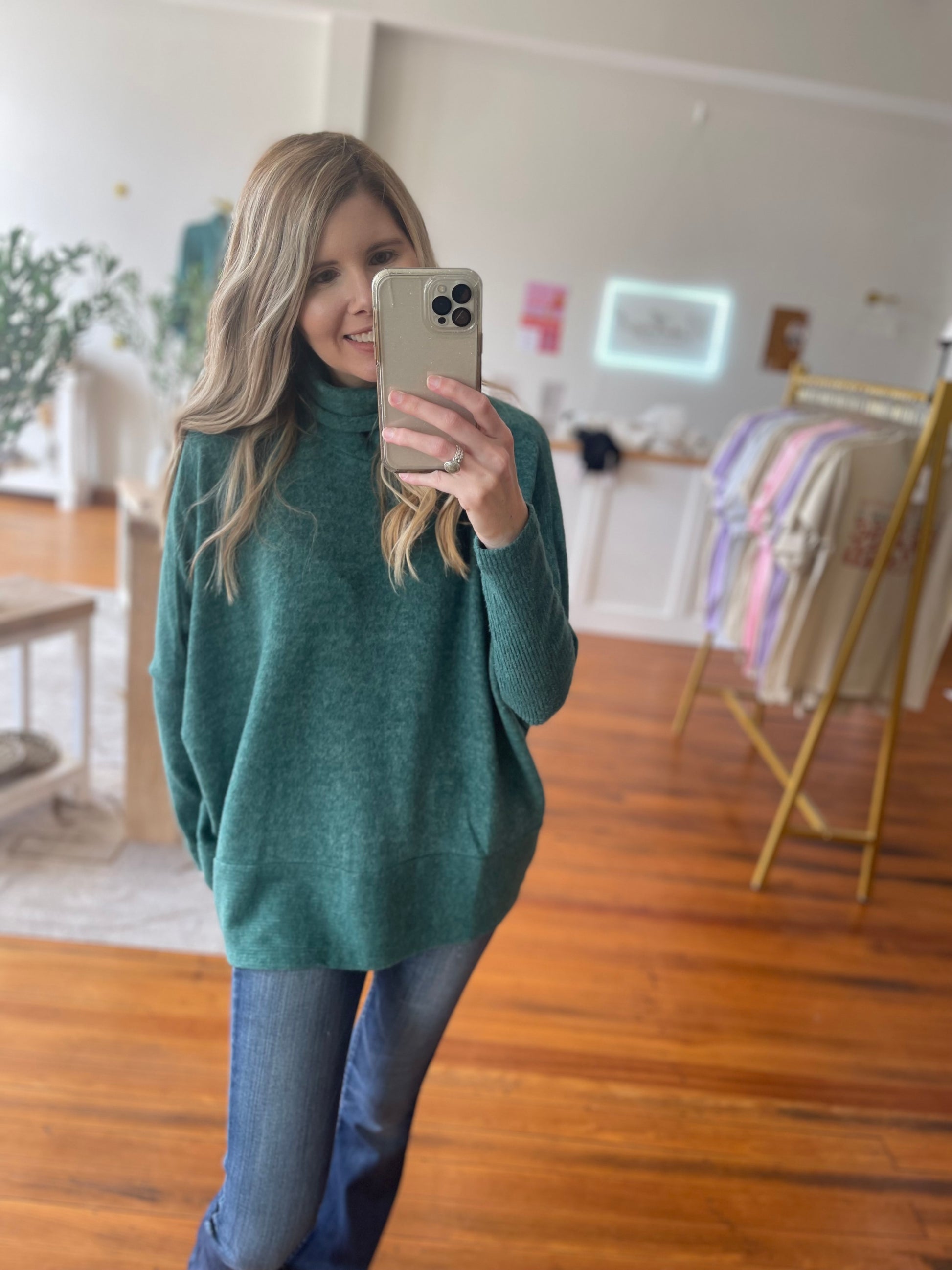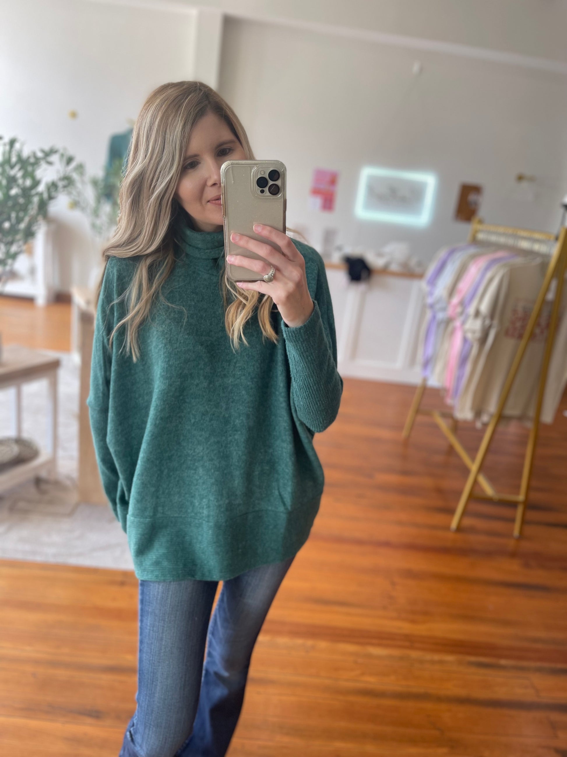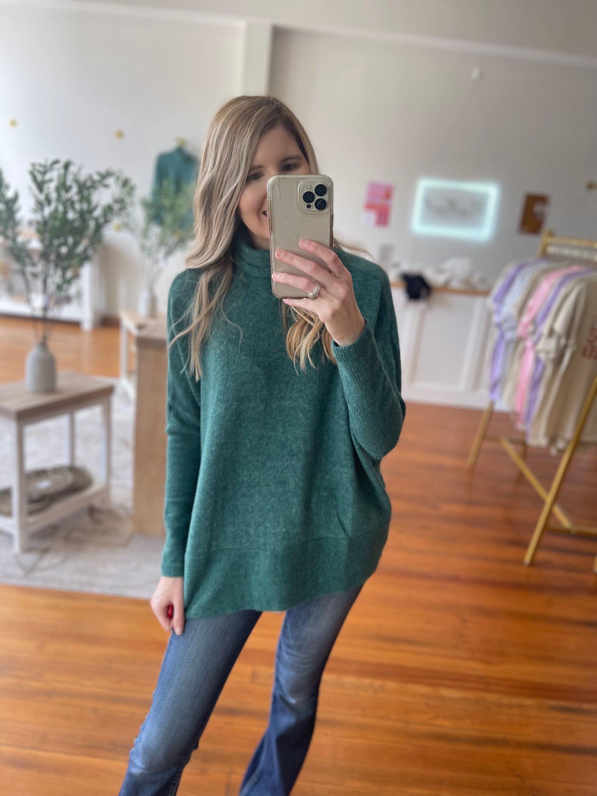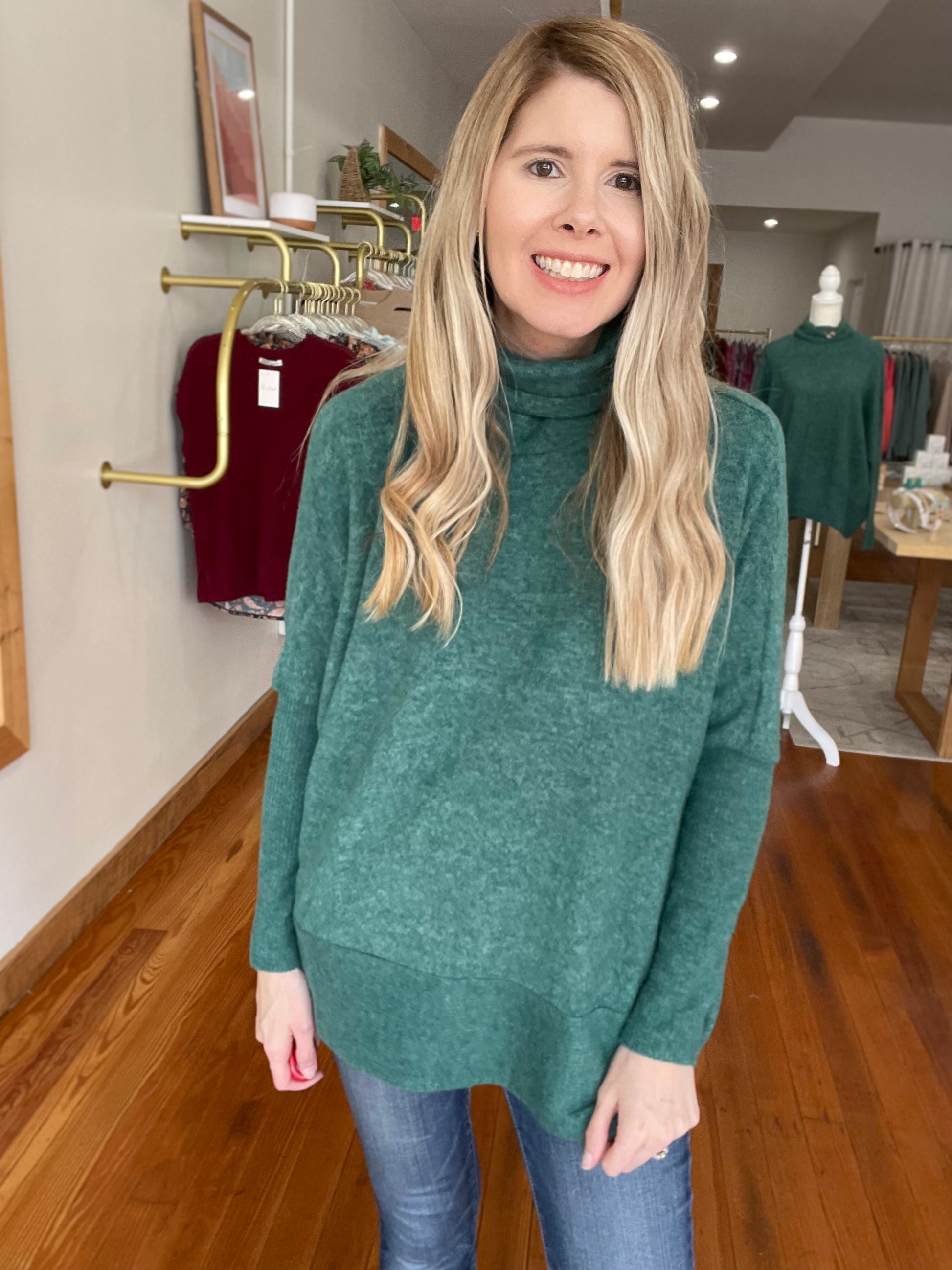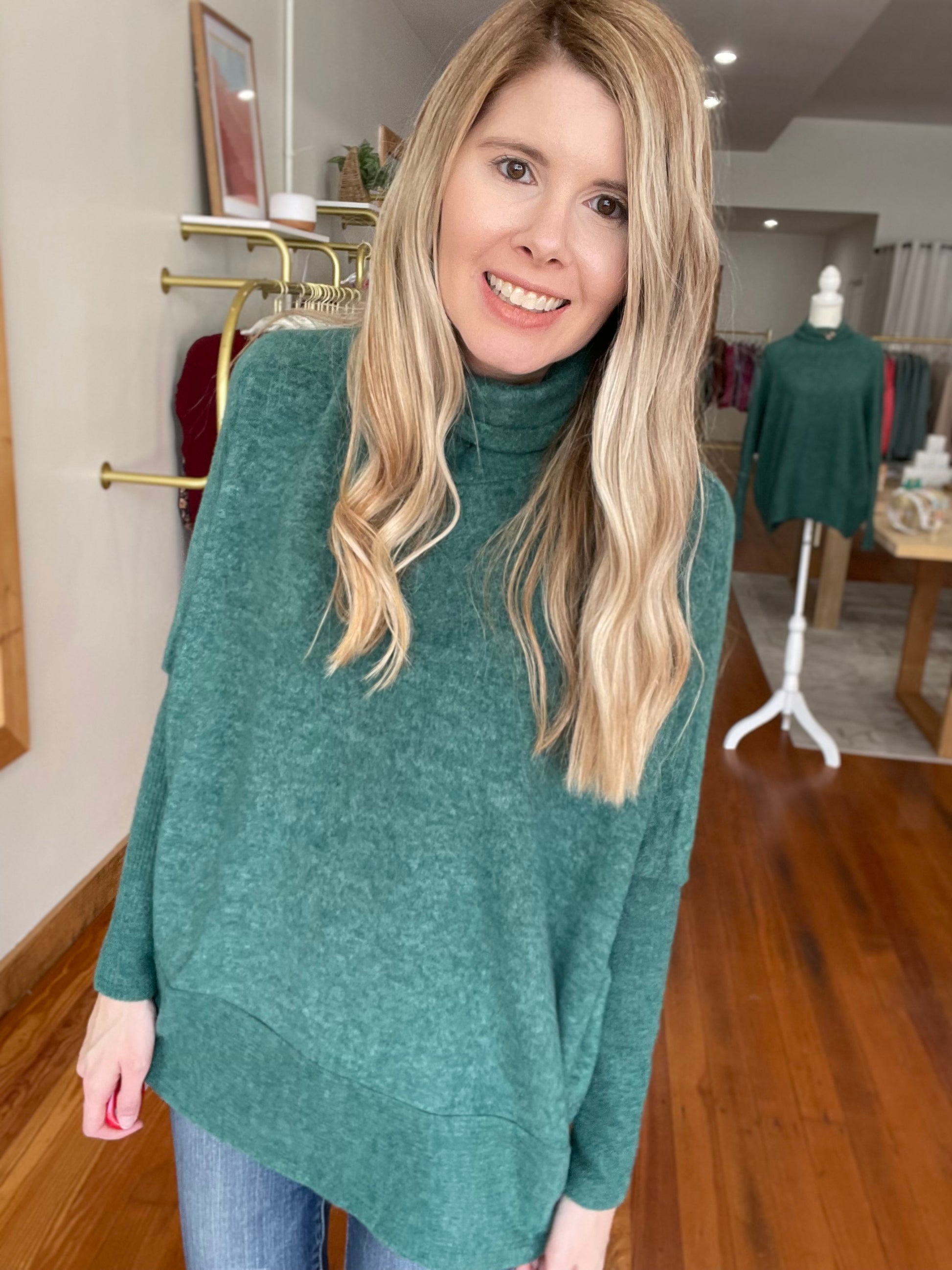 Embrace warmth and effortless style with the Cozy Canopy turtleneck sweater. Crafted in a brushed melange hacci knit, this cozy essential delivers a plush hand, refined texture, and a flattering silhouette that elevates everyday outfits.