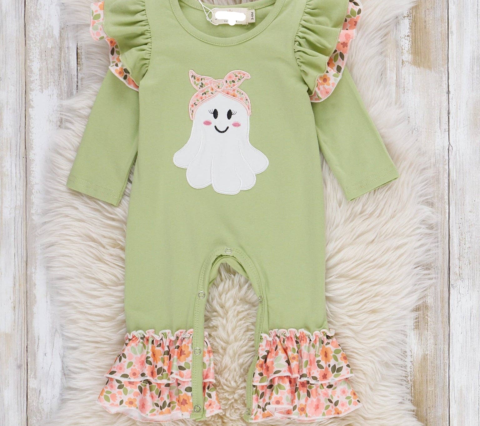 Flowers don't stop blooming in autumn! The Ghostly Frolicking Embroidered Ruffle Romper brings reminders of meadows and sunshine with adorable ruffles and floral decals, while adding a playful Halloween twist with the charming embroidered ghost. This cheerful one-piece from Marie Nicole Clothing is perfect for any autumn occasion, indoors or out.