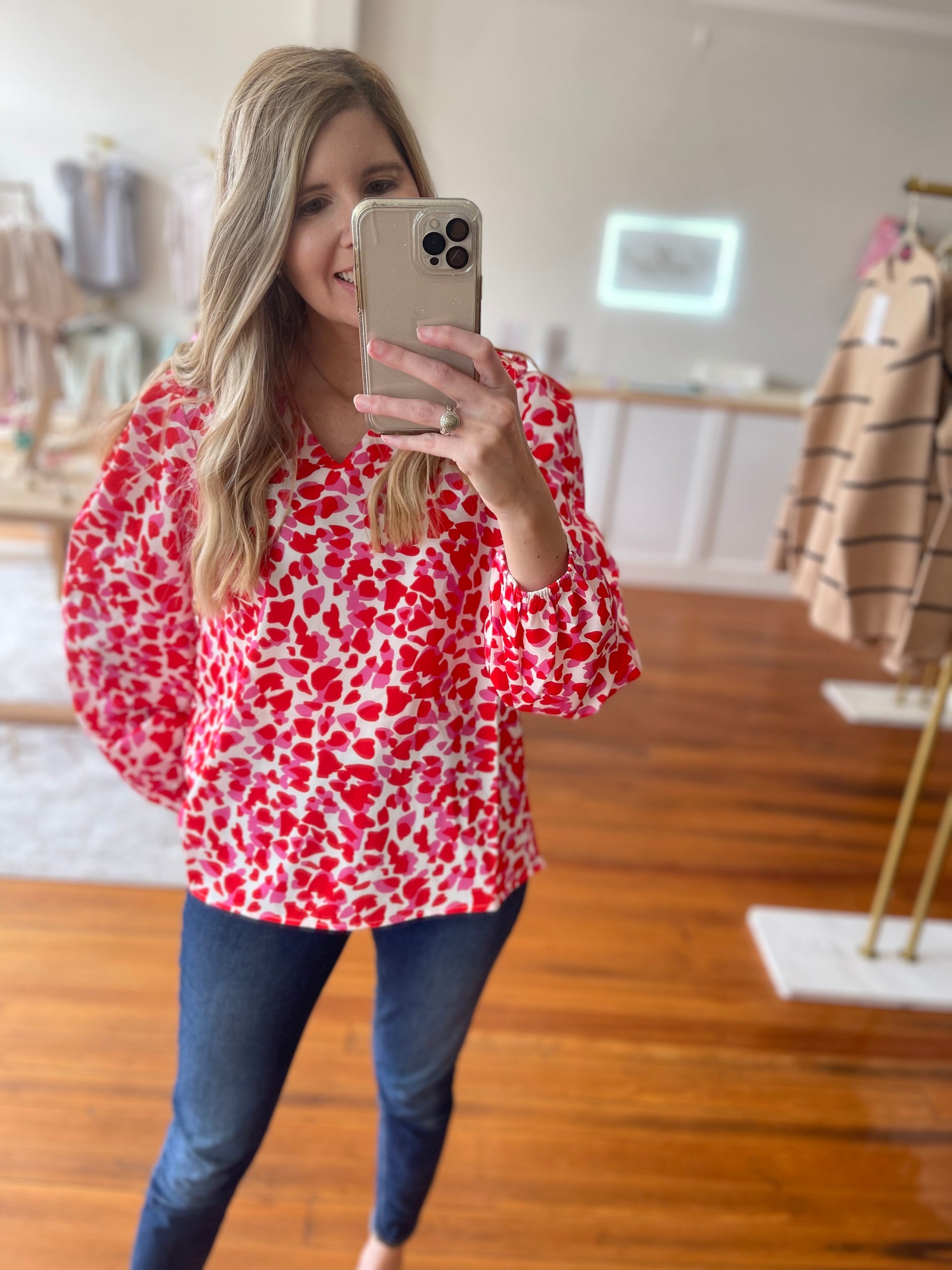 Introducing the Love Is In The Air blouse, a delightful addition to your wardrobe that captures the essence of fun and romance. This breezy and playful heart top is the perfect choice for any occasion, especially as a standout option for your Valentines outfit. With a charming heart pattern and a relaxed fit, this blouse effortlessly combines comfort with style.
