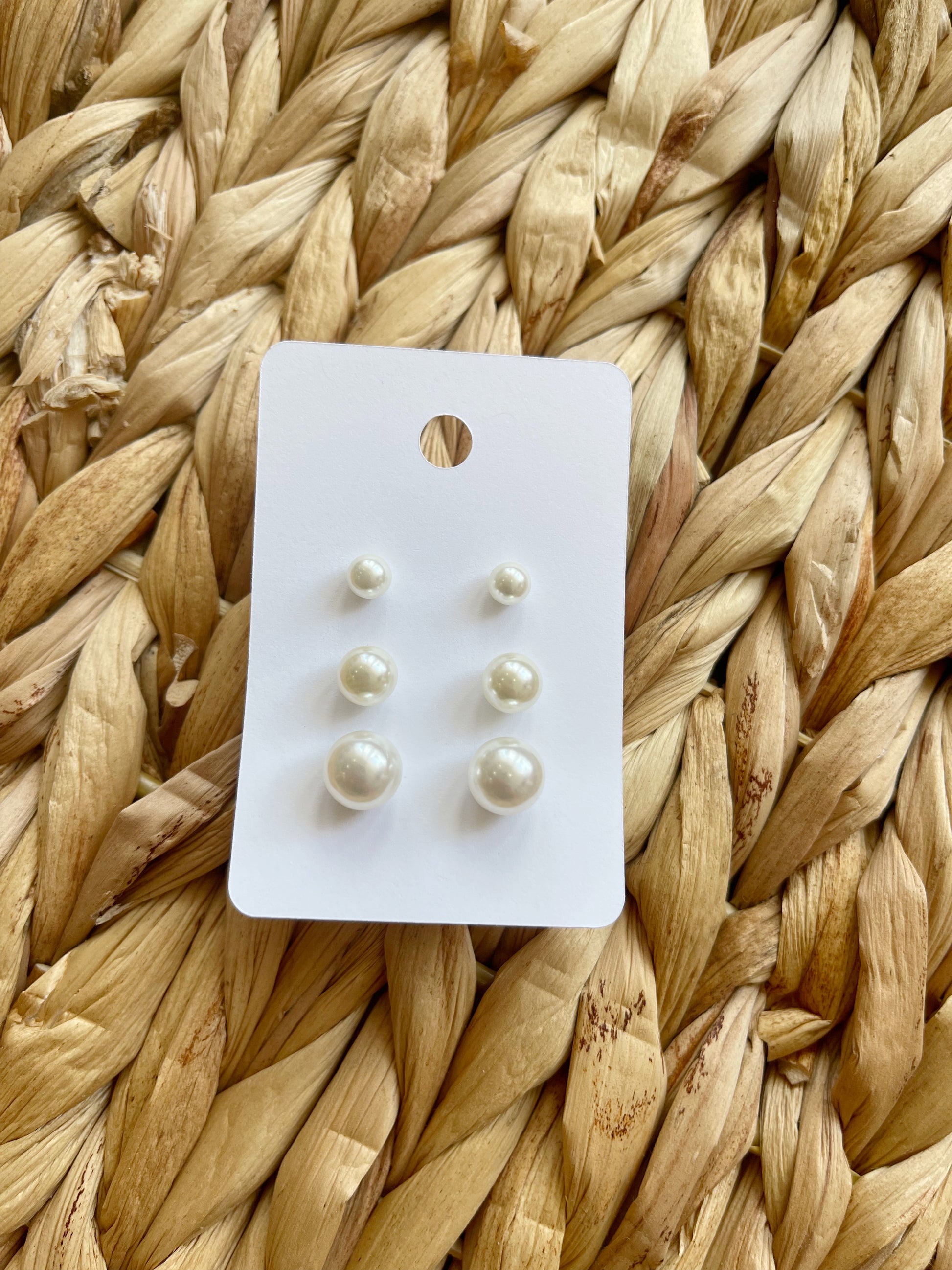 Elevate your everyday style with our Pearl Trio Earrings—a refined set of faux pearl stud earrings that arrives in three perfect sizes. This 3-pair collection delivers timeless elegance in a lightweight, versatile package, ideal for mixing and matching with any look.